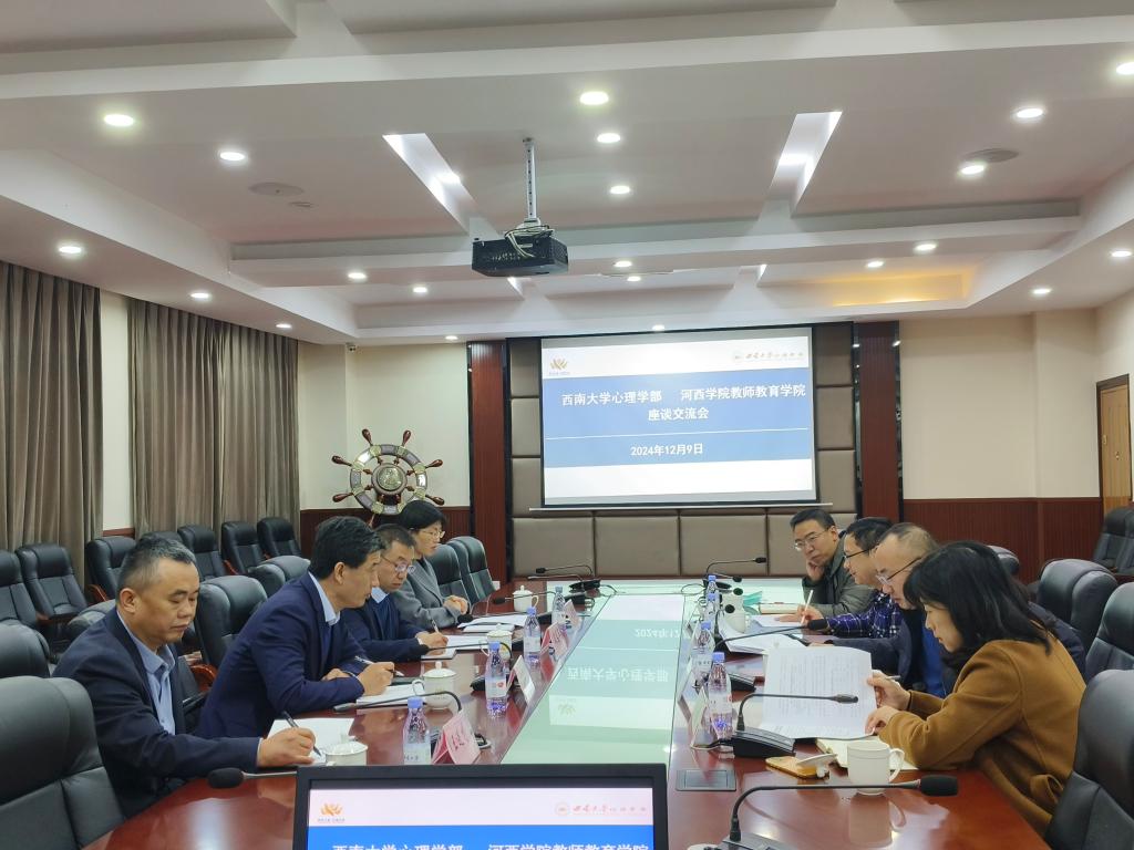 西南大学西南民族教育与心理研究中心主任张学敏教授详细介绍了中心发展历程、研究方向和重要成果。蒋立松副主任重点介绍了铸牢中华民族共同体意识教育实验室的建设背景、思路框架、实验概况、建设成果等基本情况,并希望通过深化交流合作开展河西走廊铸牢中华民族共同体意识教育研究。