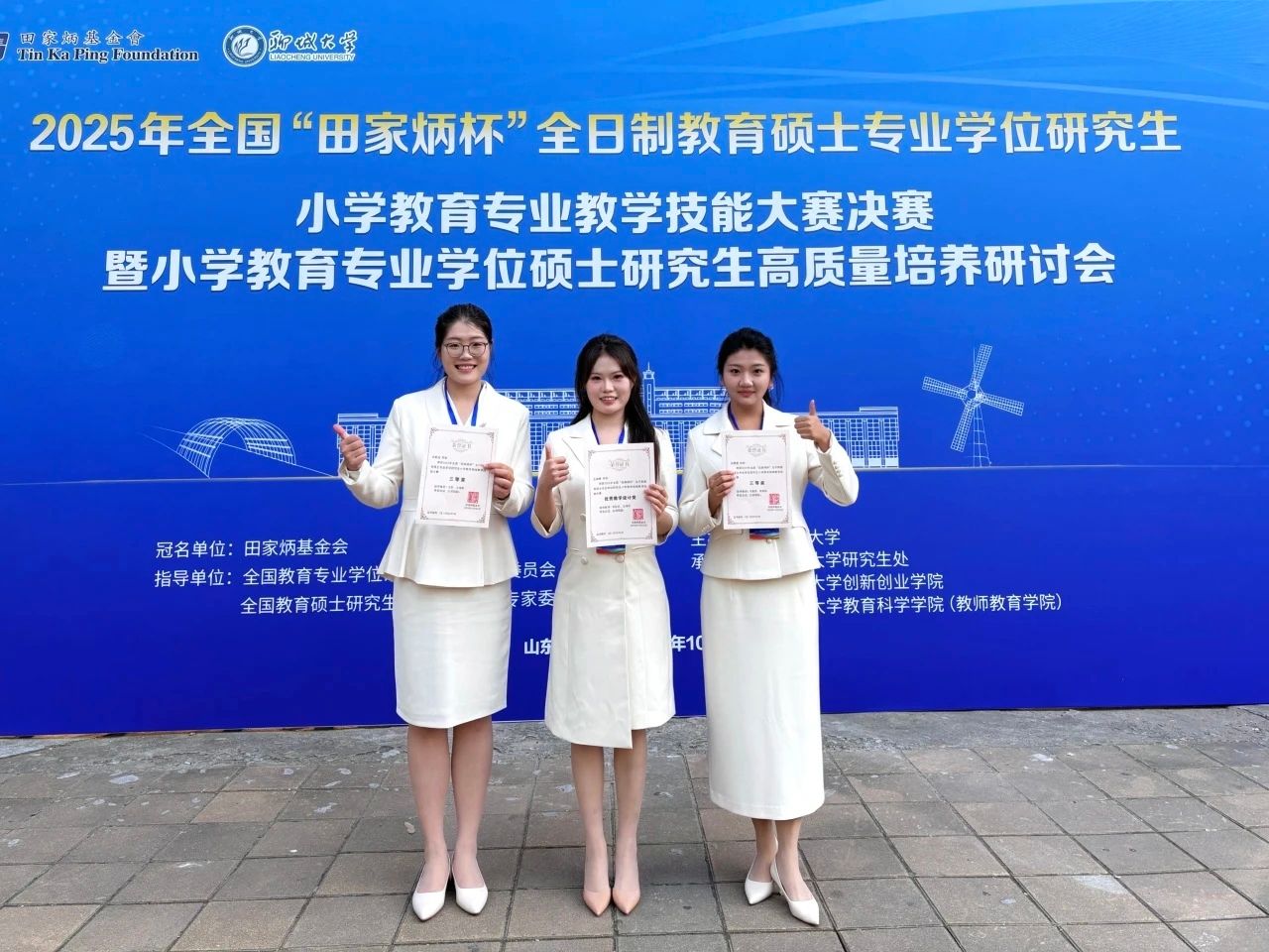 10月24日至26日,2025年全国“田家炳杯”全日制教育硕士专业学位研究生小学教育专业教学技能大赛决赛在聊城大学成功举办。公司教育硕士(小学教育)研究生王凯沄和王雅雯两位同学荣获三等奖,王海婷同学荣获优秀教学设计奖。