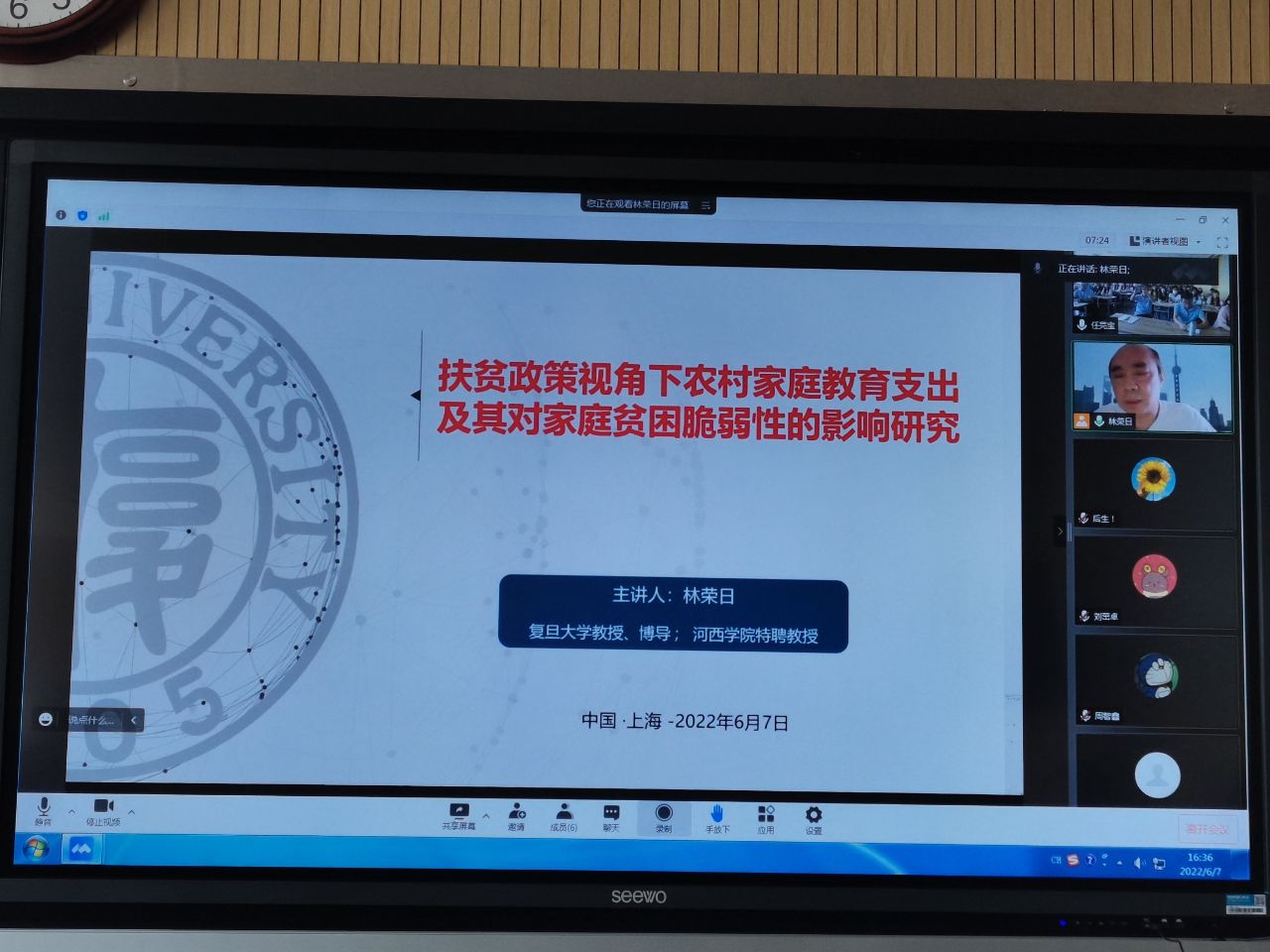 6月7日下午,SUNBET申博举办了第二十二届祁连学术月校外专家学术报告会,邀请复旦大学博士生导师林荣日教授采用线上方式作了题为《扶贫政策视角下家庭教育支出及其对家庭贫困脆弱性的影响研究》的报告,公司师生100多人参加了报告会。