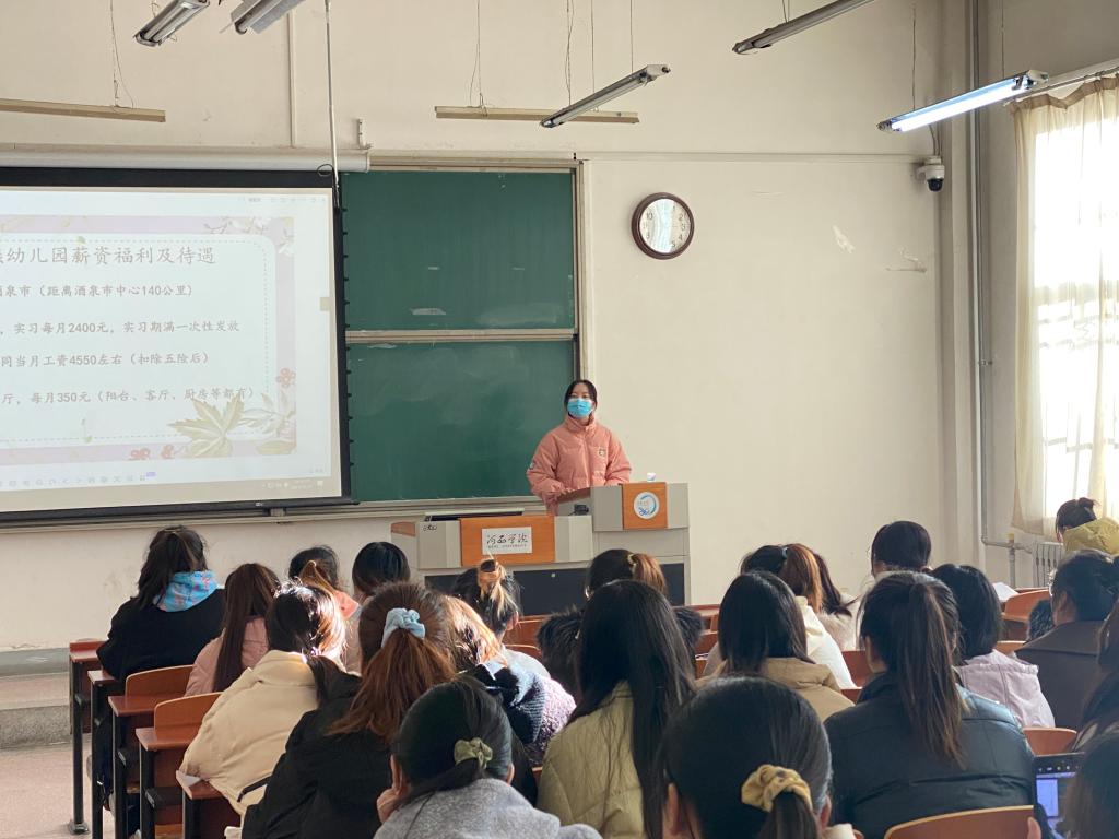为了更好帮助2022届毕业生实现就业,SUNBET申博于2021年12月27日邀请兰空飞行训练基地蓝天银燕幼儿园赵园长一行3人来校进行宣讲招聘,公司150多名学前教育专业毕业生参加了此次招聘活动。